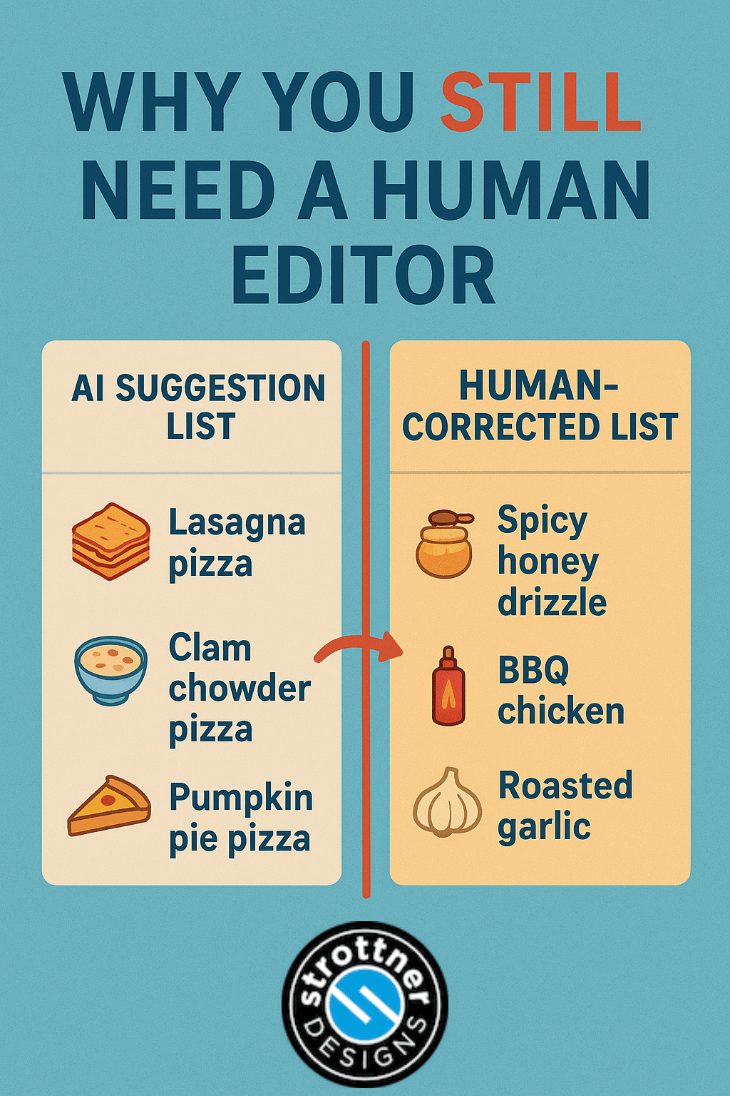At Strottner Designs, we’ve made peace with the robots. We treat AI as a turbocharged assistant, not a replacement. And we help our clients do the same; growing their websites, sharpening their SEO, and making sure their brand voice doesn’t sound like it was generated by a toaster.