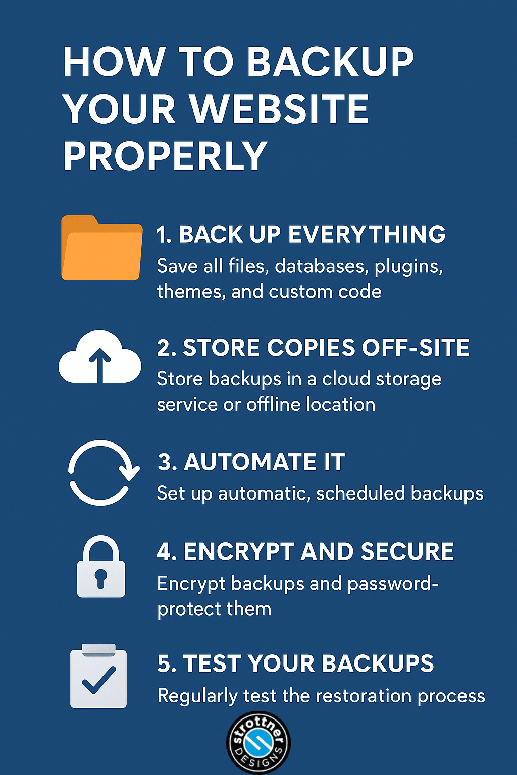 At Strottner Design, we build backup and security directly into every website we manage. Our system runs automated, encrypted backups every day and stores them off-site for maximum safety.